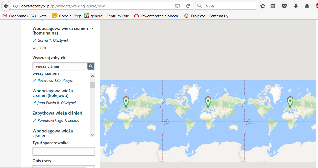 Po wyszukaniu zabytków i próbie dodania ich do mapy, albo mapa oddala się do widoku całej Ziemi (screen _1) albo znaczniki nie pojawiają się na mapie, a mapa centruje się w dziwnym miejscu (screen _2)